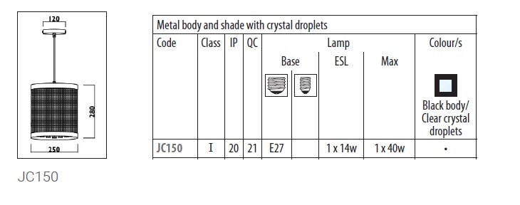 1x14W E27 230V Metal Body & Shade with Crystal Drops Decorative Pendant