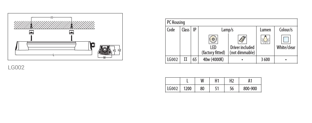 40W 230V LED PC Housing Vapour Proof Fixture Cool White