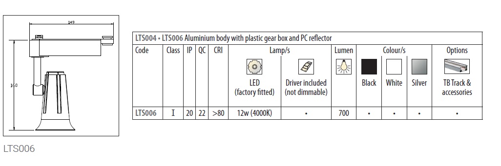 12W 230V Aluminium Body With Plastic Gear box & PC reflector LED Track Mounting Cool White